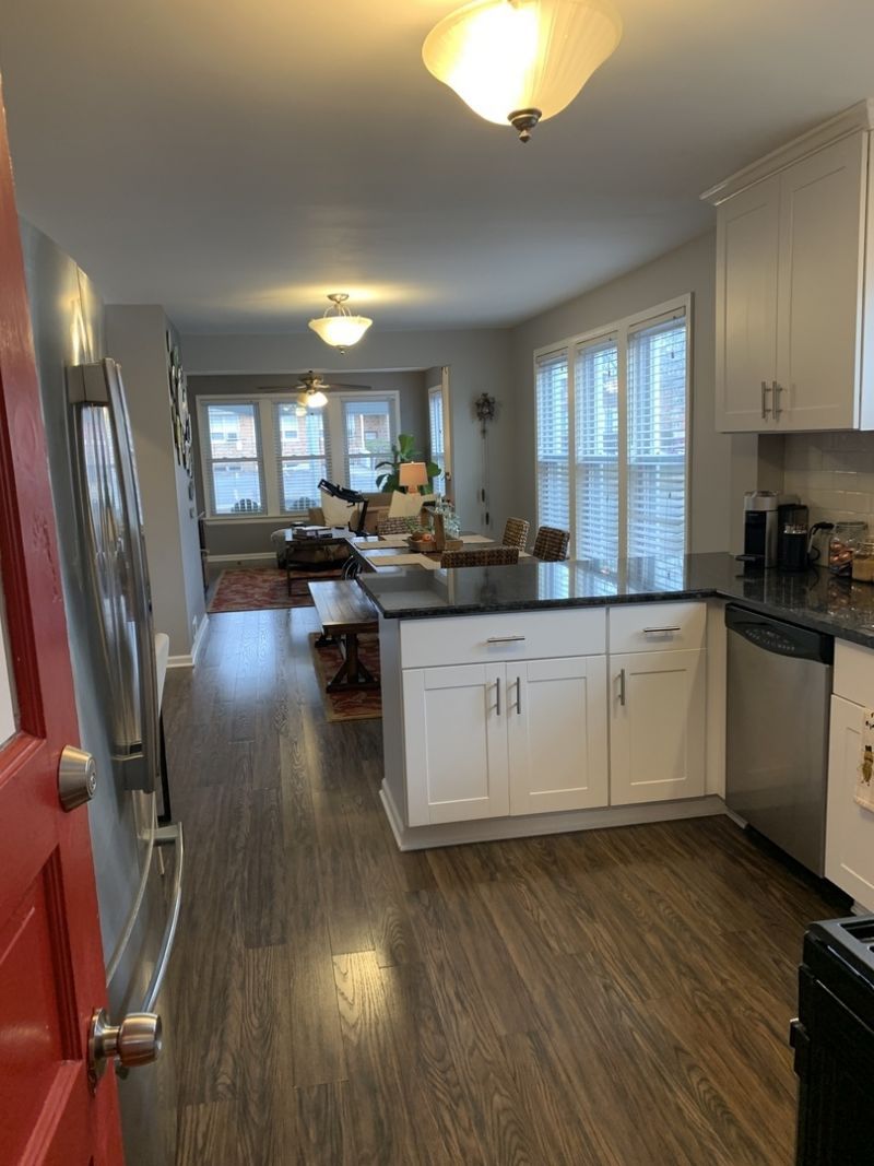 Amazing Downtown Palatine Location! Steps from Train, Restaurants, and Retail. First Floor Unit of a 2 Flat, with 2 Beds, 1 Bath. Updated White Kitchen, Granite Counters, Breakfast Bar, SS Appliances, Wood Laminate Floors Thru-Out, Newer Windows, Newer Plumbing, Newer Electrical, Newer HVAC, Siding, Roof, Wood Blinds, Trim, Paint, Bathroom Shower, Pedestal, Toilet, Etc... Shared W/D in LL included in rent, not Coin Laundry. Big, Shared Backyard space for Barbecuing. Two Outdoor Parking Spaces Included. No pets. (Pictures are from a previous tenant)*Note all Utilities are included in rent!*